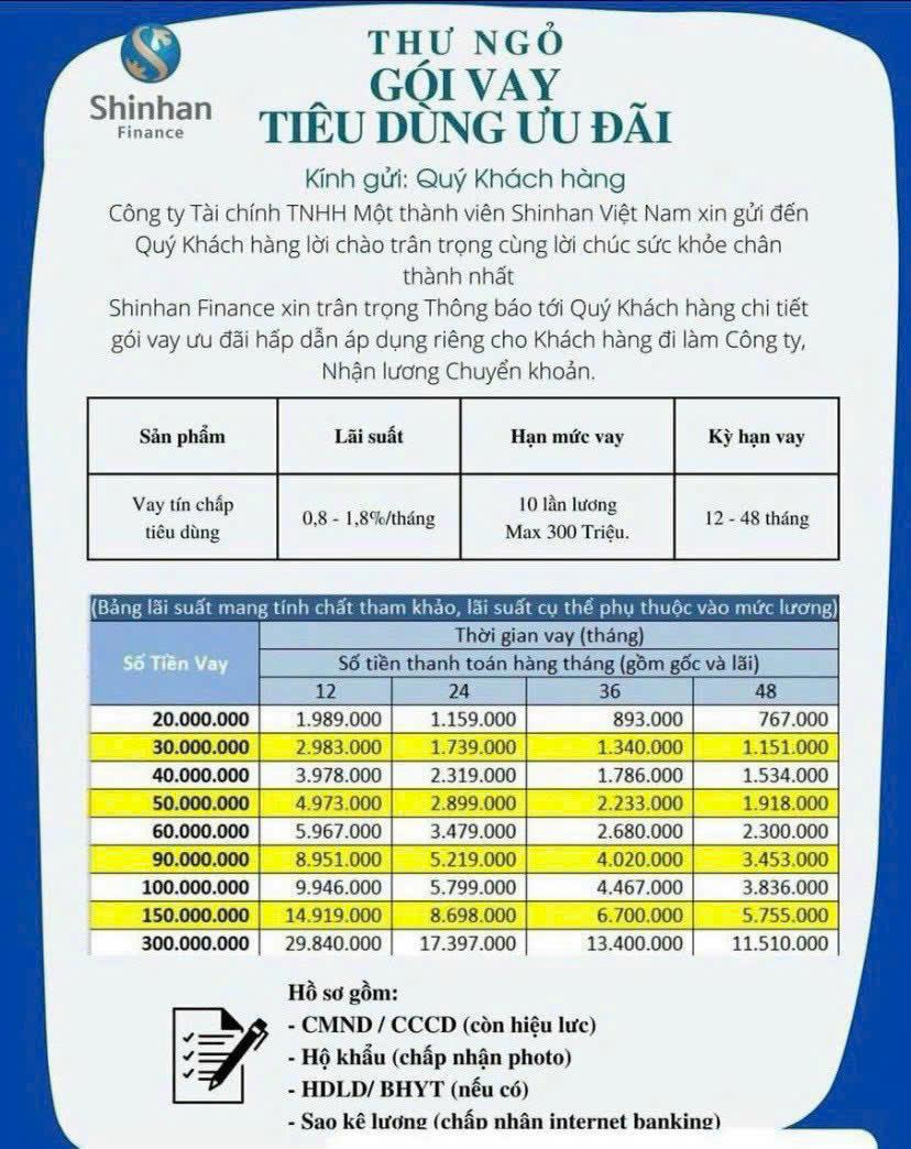 Shinhan Finance là đơn vị uy tín chuyên cung cấp các gói vay tín chấp trả góp, vay mua ô tô – xe máy, cùng nhiều hình thức hỗ trợ tài chính linh hoạt, nhanh chóng.